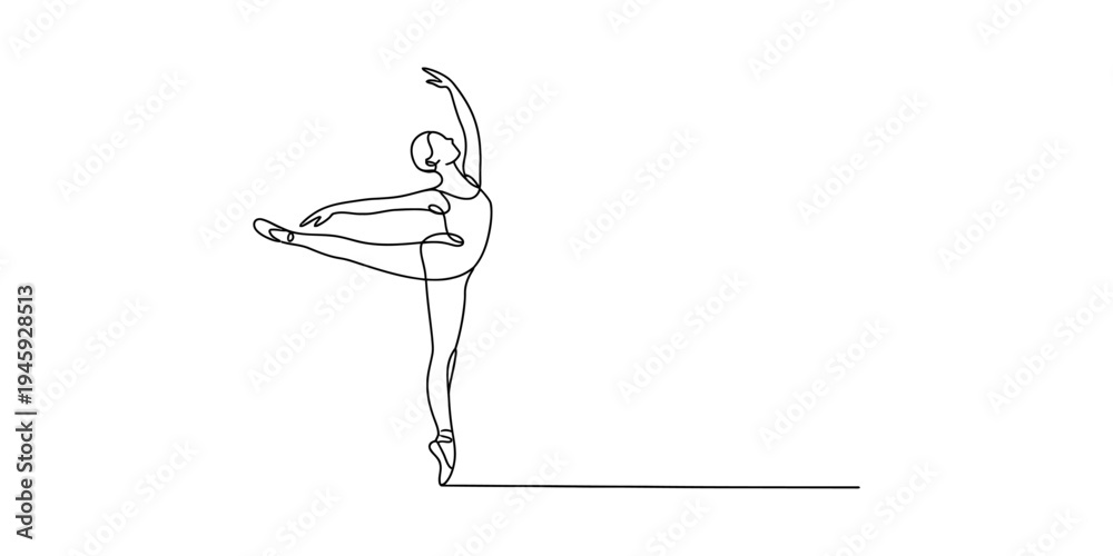 A minimalist continuous line art drawing of a ballerina performing a graceful arabesque pose en pointe Vector, illustration #1945928513