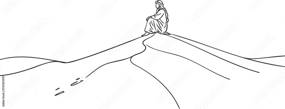 A minimalist line art illustration depicting a solitary figure on sand dunes in a desert landscape. #1767833907