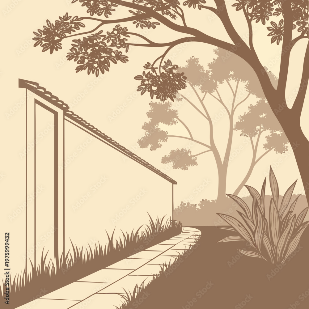 A minimalist vector illustration of a serene garden pathway leading to a simple building surrounded by trees and plants #1975999432