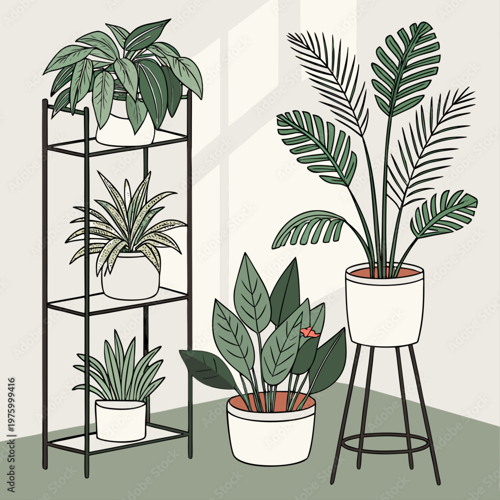 A minimalist vector illustration of potted plants on stands and shelves in a modern room #1975999416