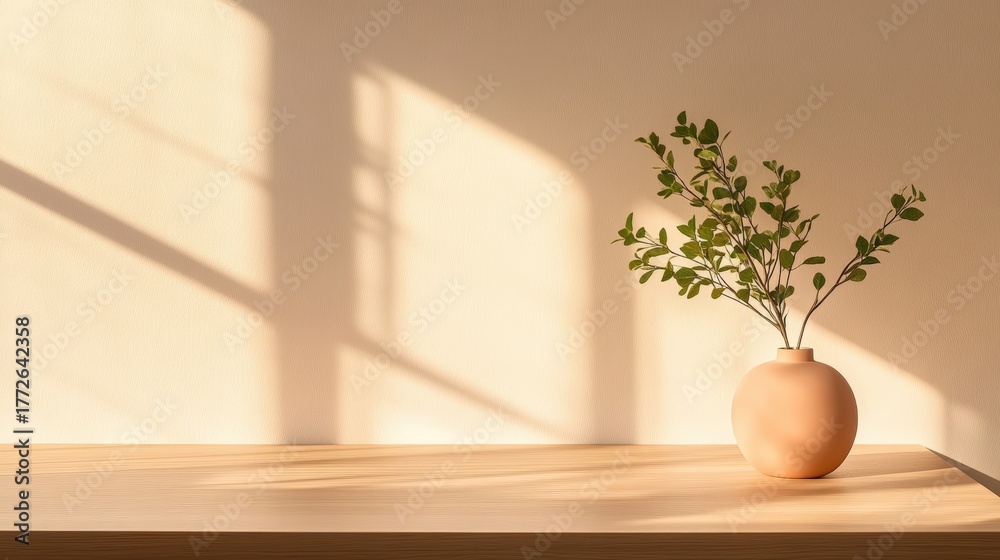 A minimalistic scene featuring a vase with greenery on a wooden table, illuminated by soft shadows from sunlight on a beige wall. #1772642358