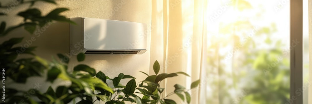 A modern air conditioner mounted on a wall, surrounded by green plants and illuminated by warm sunlight filtering through sheer curtains. #1768413454