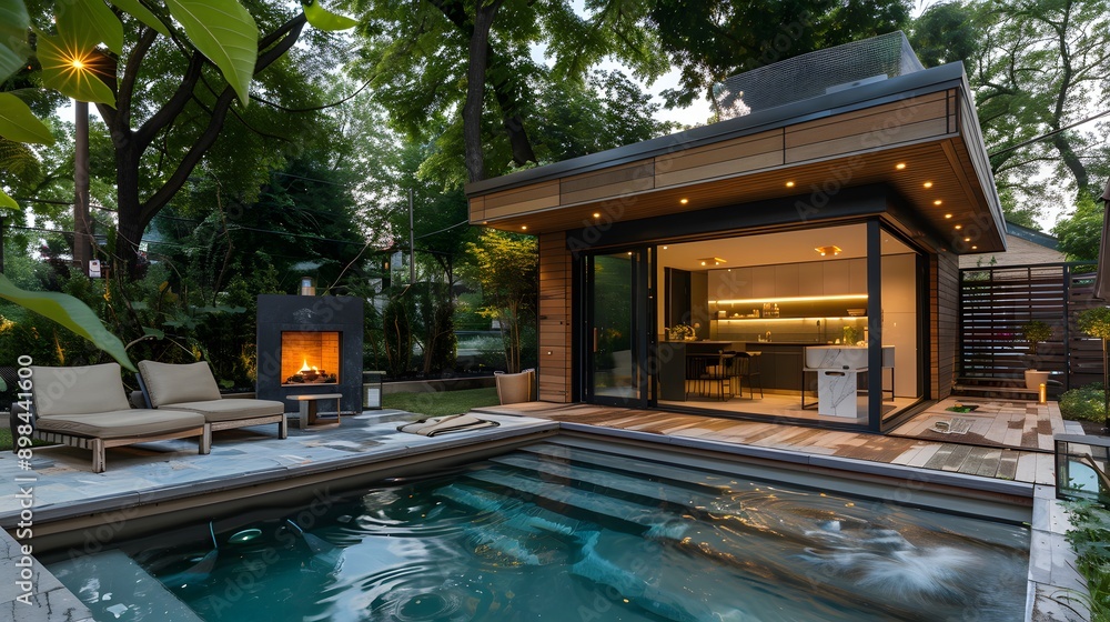 A modern backyard oasis featuring a sleek pool, outdoor seating, and a cozy fireplace surrounded by lush greenery. #898441600