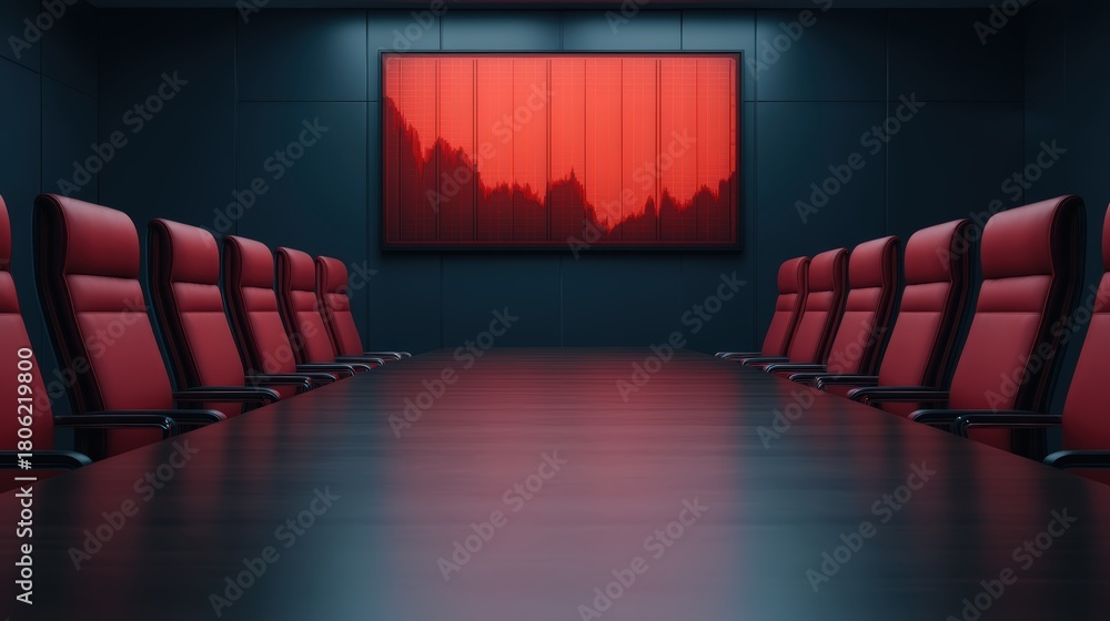 A modern conference room featuring a long table, red chairs, and a large screen displaying a downward trend in red tones. #1806219800