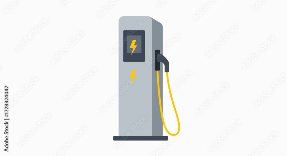 A modern electric vehicle charging station with a yellow charging cable and a lightning bolt symbol indicating power. #1728324047
