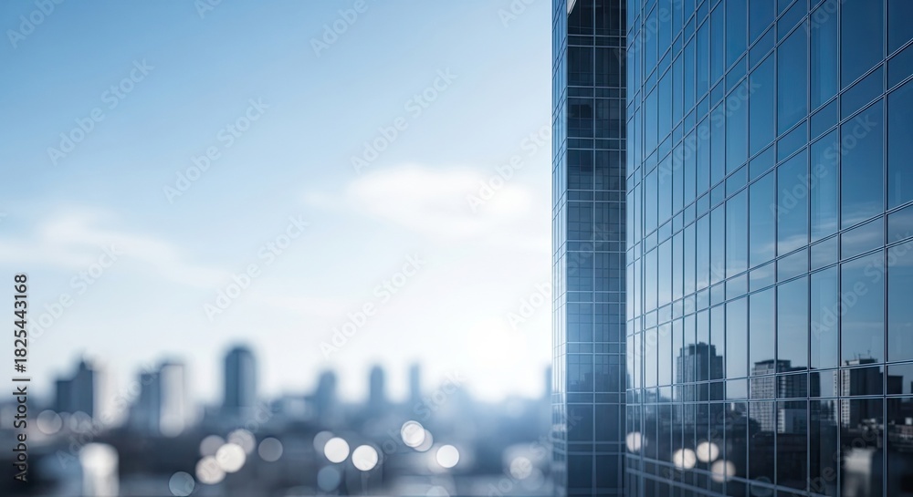 A modern glass skyscraper with a cityscape in the background. #1825443168