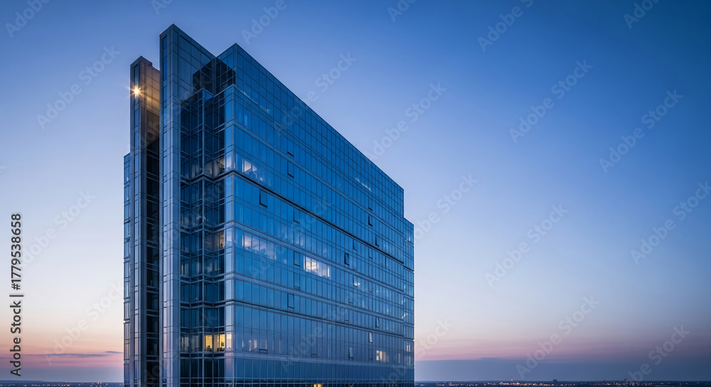 A modern glass skyscraper with multiple windows, representing corporate power, ambition, and architectural design against a gradient sky backdrop #1779538658