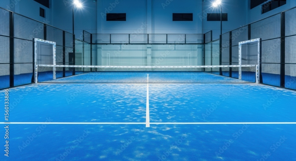 A modern indoor sports facility with an empty blue padel court under bright lights, ready for a recreational game or professional tournament. #1560133886