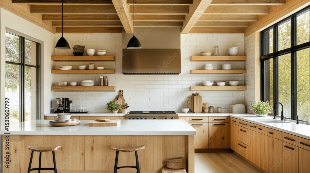 A modern kitchen features light wood cabinetry, a metal countertop, white tiled backsplash, open shelving, and wooden ceiling beams under soft lighting. #1530607797