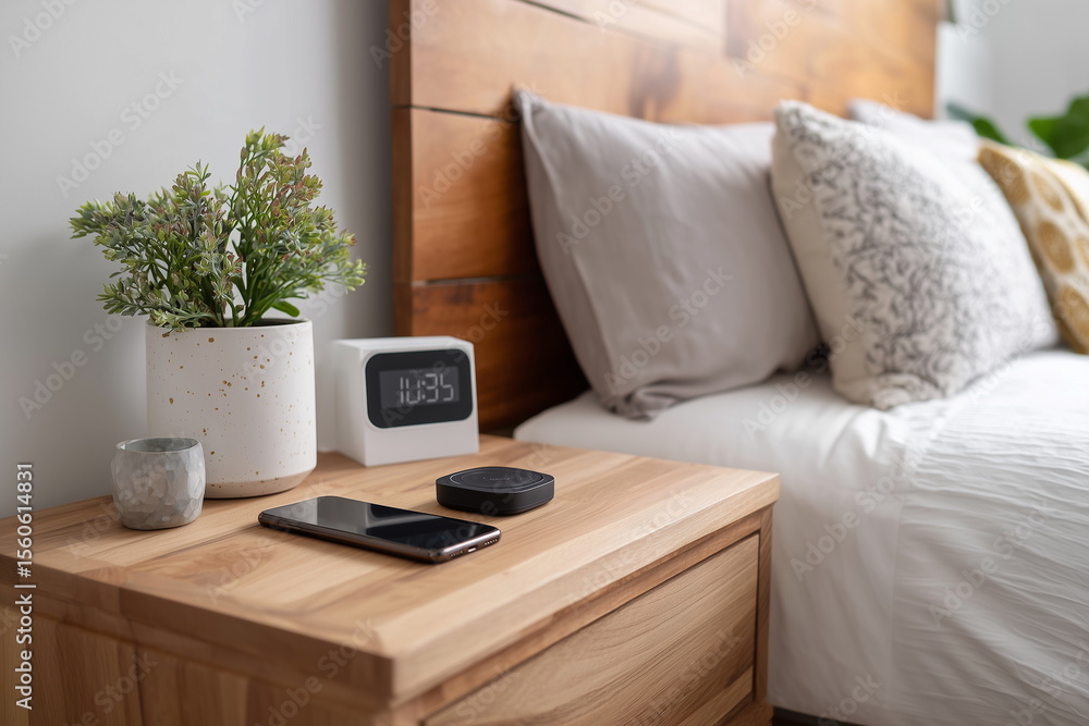 A modern minimalist nightstand next to a neatly made bed, featuring a wireless phone charger, a small potted plant, and a digital clock on a clean surface. #1560614831