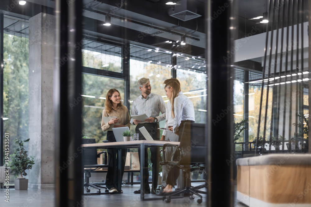 A modern office interior, featuring a blurred view of workers at desks, through a glass partition #1941533501