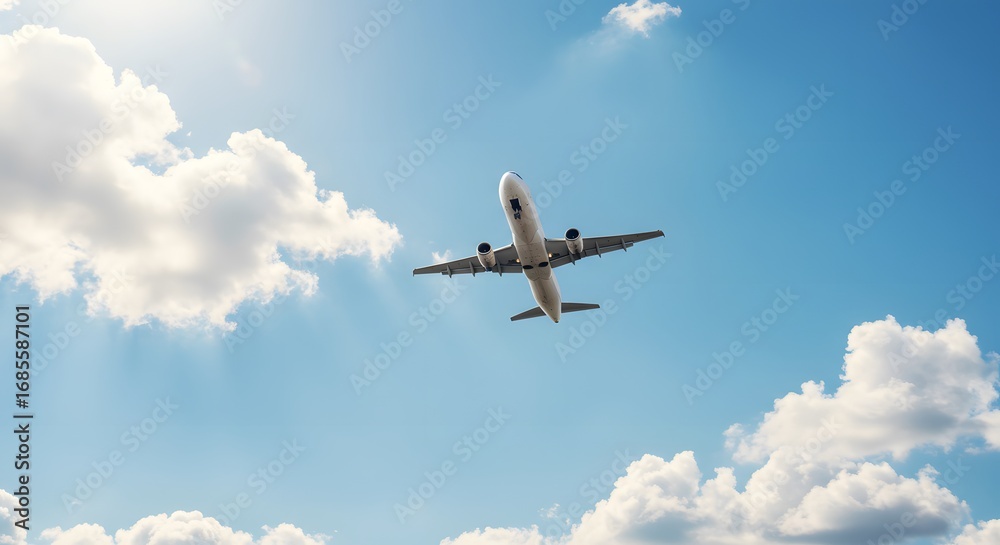 A modern passenger airplane flying high in a bright blue sky with fluffy clouds, creating a scene of travel and adventure #1685587101