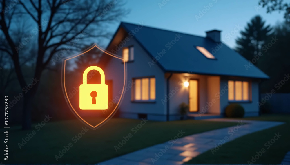A modern smart home with a glowing padlock and shield overlaid on it symbolizes a safe and secure home. #1071237230