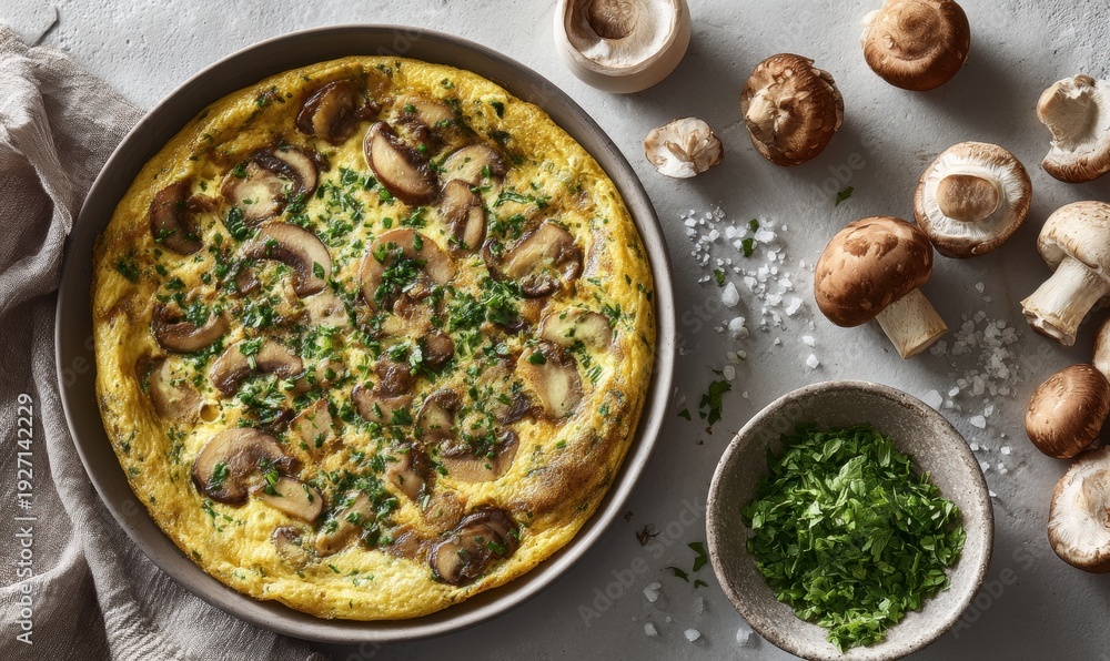 A mushroom omelet with parsley and mushrooms on a table #1927142229