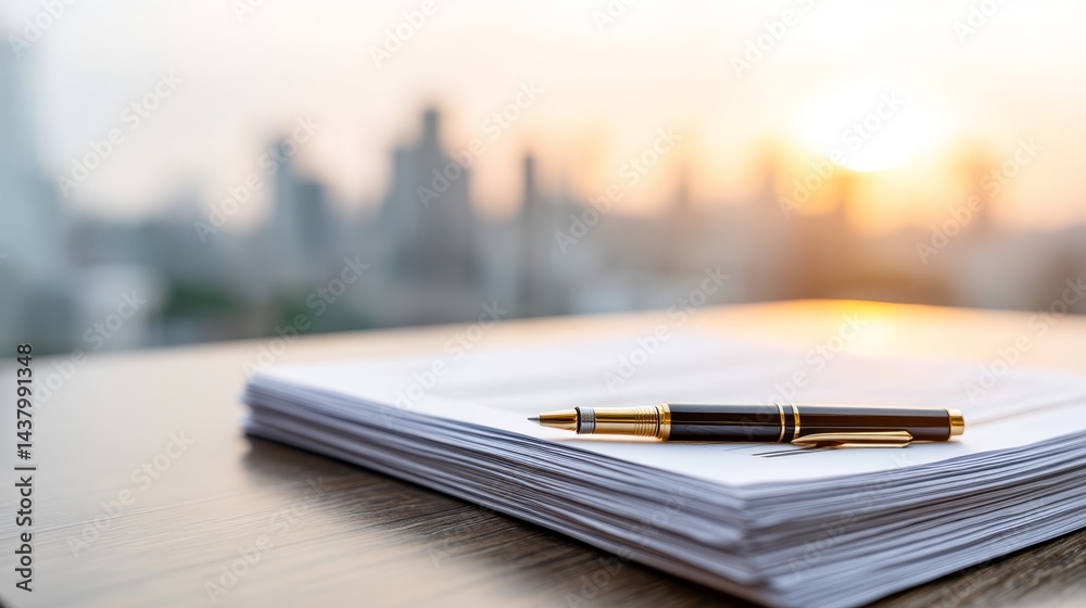 A neatly arranged stack of blank legal documents rests with a glossy fountain pen on a smooth glass desk, showcasing professionalism against a blurred urban backdrop #1437991348
