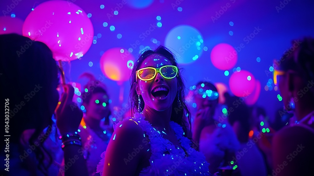 A neon-themed birthday setup featuring glow sticks, black lights, and neon paint splattered on the walls, LED decorations enhancing the glow, party atmosphere with guests wearing glowing accessories, #1043032706
