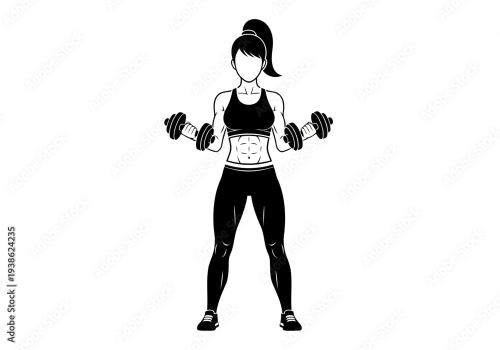 A nice and perfect looking strong woman in a black sports bra and leggings holding dumbbells in both hands #1938624235