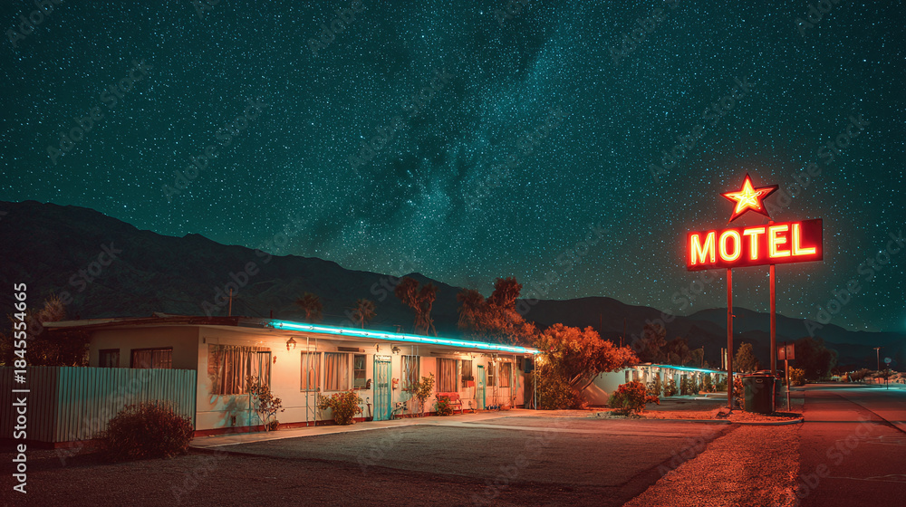 A nostalgic motel under a starry night sky, with a neon sign glowing brightly. A sense of travel and solitude pervades the scene, as mountains can be seen in the distance #1845554665