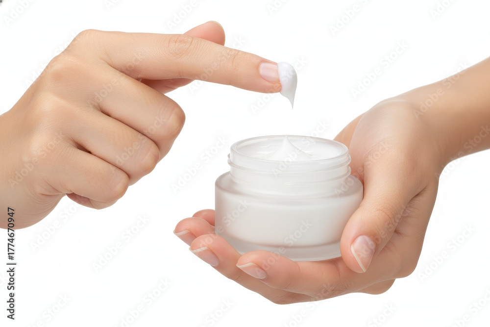 A pair of hands holding a jar of white skincare cream, one hand squeezing out a small amount of cream #1774670947