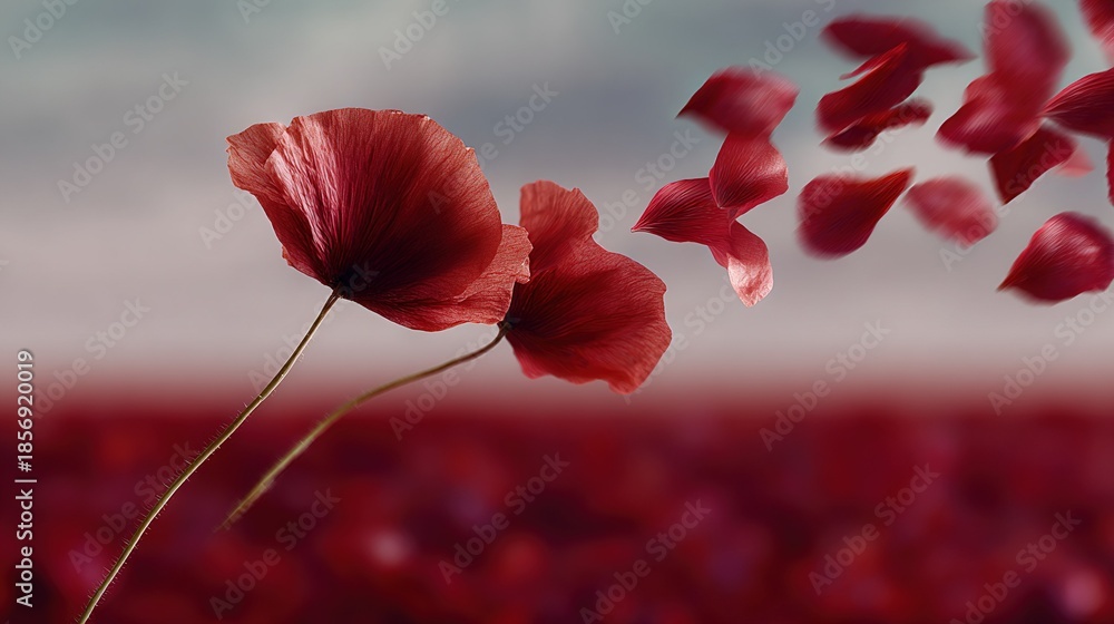 A pair of red blossoms atop a sea of red petals beside a gray and white facade #1856920019