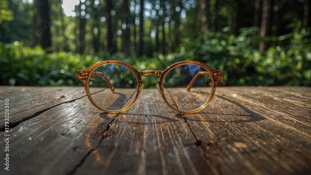 A pair of round glasses with a brown frame resting on a wooden surface in a forest setting. #1793528388
