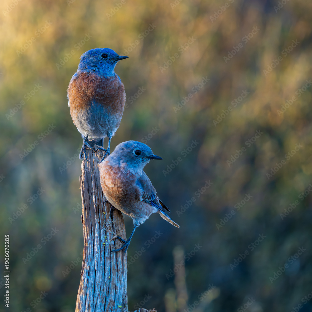 A pair of Western Bluebirds (Sialia mexicana) in central Oregon perched on a worn log. #1906070285