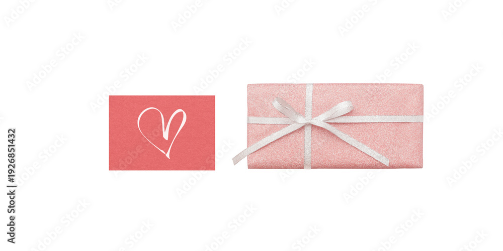 A pale pink gift box with a silver ribbon and a red card featuring a white hand-drawn heart, viewed from above #1926851432