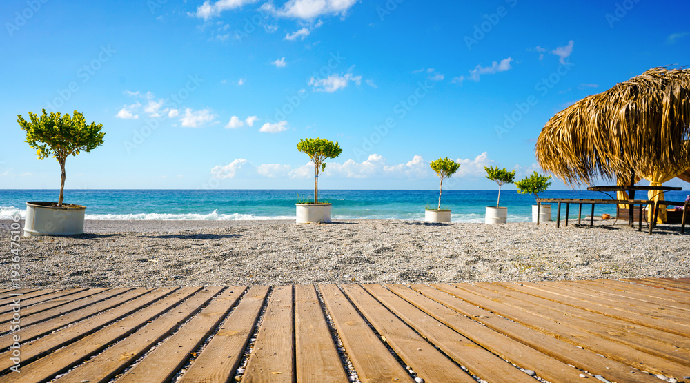 A panoramic, sunny view of a pebble beach with a wooden deck, straw umbrella, and potted trees along the turquoise sea. An inviting summer nature scene, perfect for travel and resort themes. #1936475106