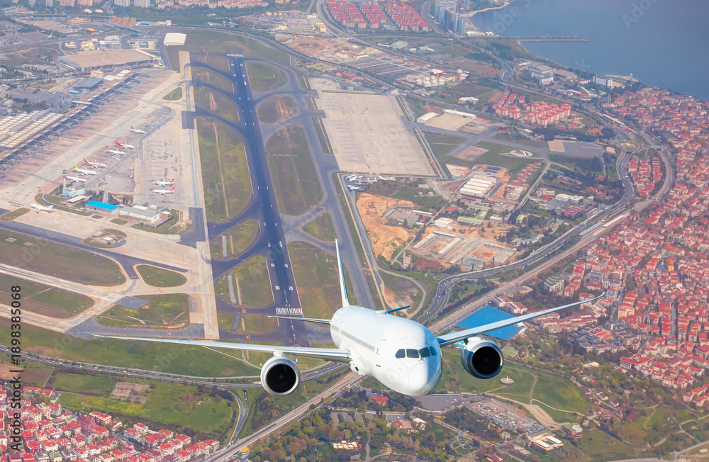 A passenger airplane is flying over istanbul city and Ataturk Airport with blue sea #1898385068