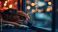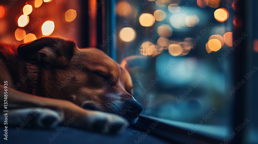 A peaceful dog sleeping beside a window with soft bokeh lights creating a warm atmosphere in the evening #1374856935