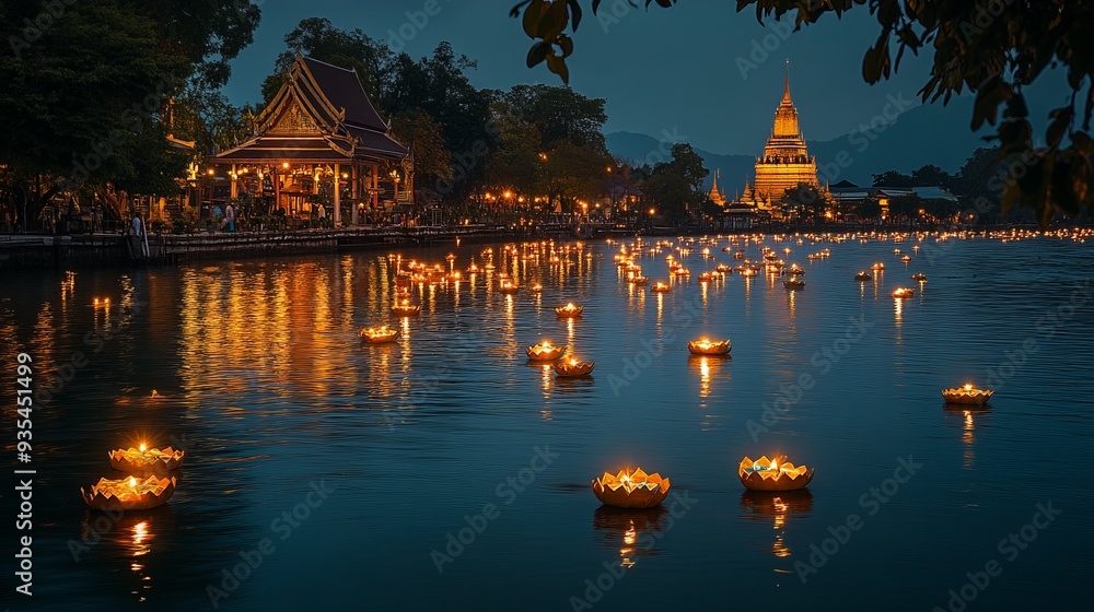 A peaceful riverside scene during the Loy Krathong festival in Thailand #935451499