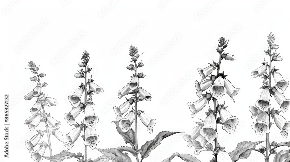 A pencil sketch of five foxglove flowers on a white background #865327132