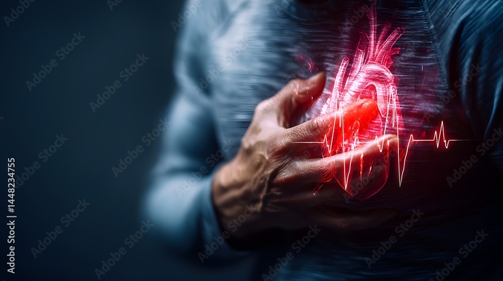 A person clutching their chest with a glowing heart and ECG waveform overlay, symbolizing cardiovascular health issues or heart disease awareness. #1448234755