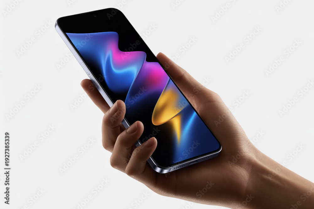 A person holding a smartphone with a colorful screen in their hand. #1927385339