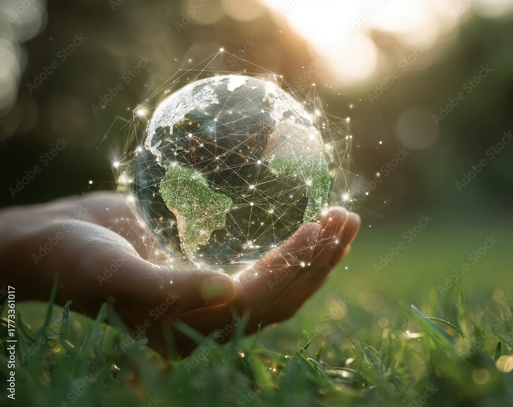 A person's hand delicately cradles a glowing globe, symbolizing global interconnectedness and environmental awareness. #1773361017