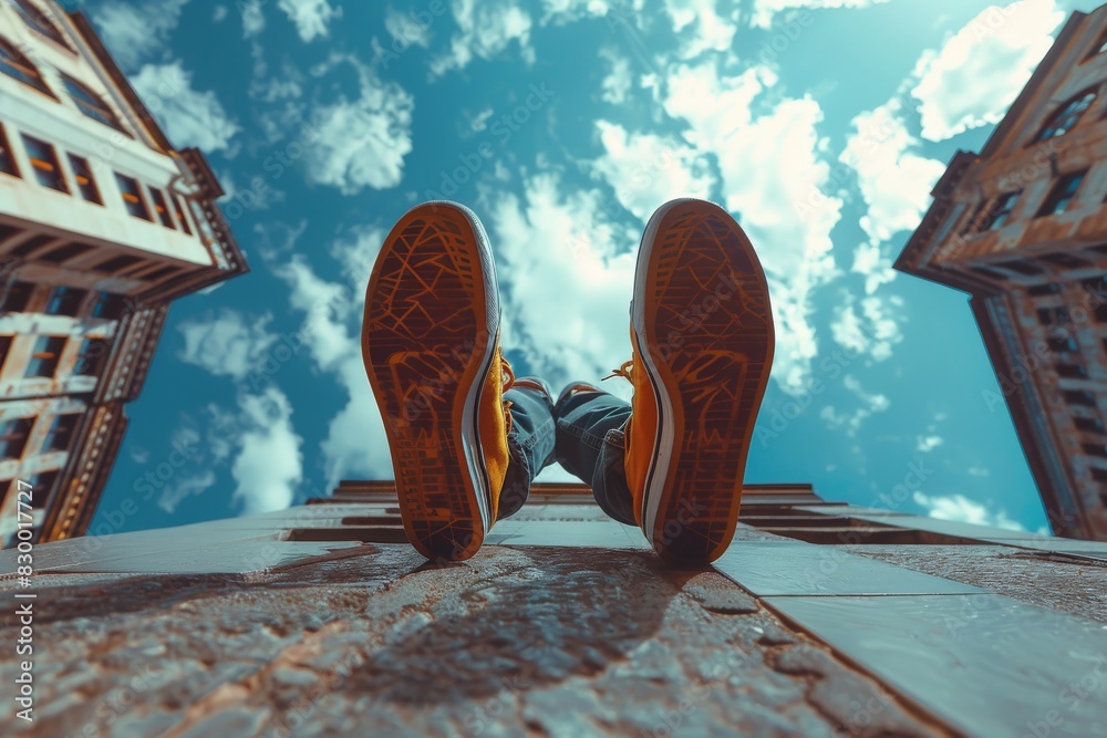 A person's legs are extended toward the sky between two high-rise buildings, shoes in focus #830017727