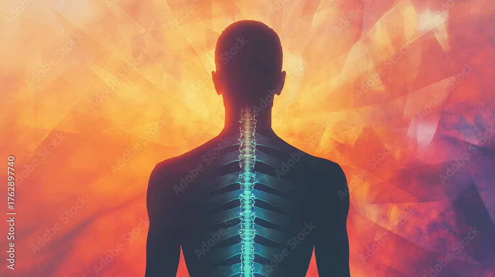 A person’s silhouette with an emphasis on their spine, glowing from within, illustrating the concept of energy flow, wellness, and body alignment in a meditative setting. #1762897740