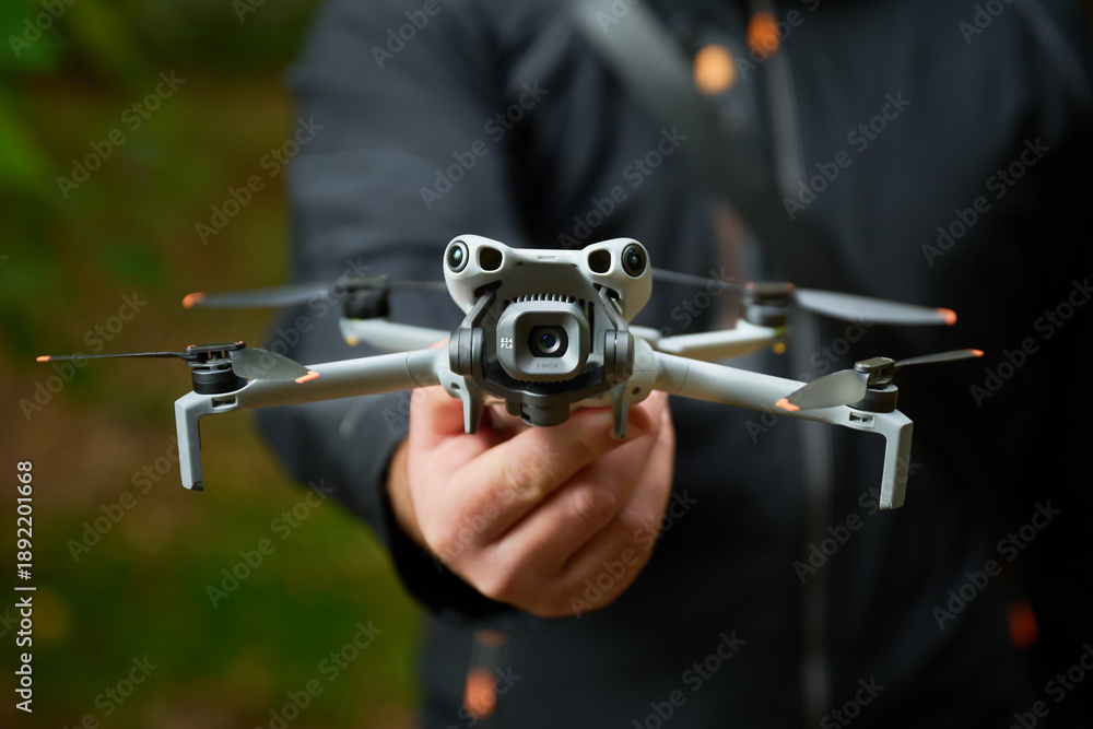 A person stands in a lush green forest, holding a drone with outstretched arms, preparing for an adventurous flight. The excitement for aerial discovery is clear. #1892201668