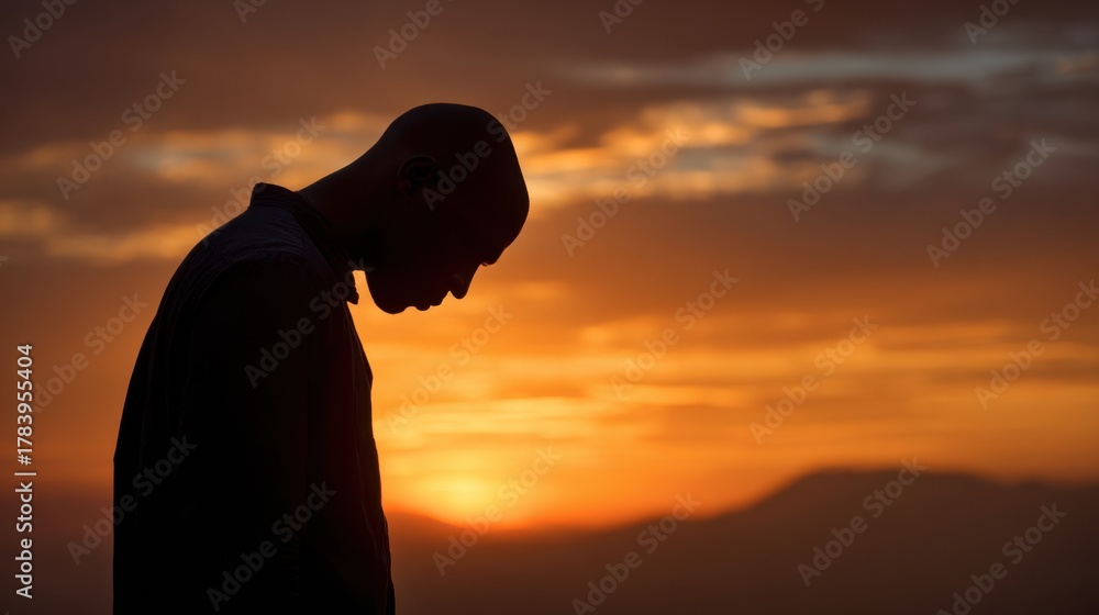 A person stands with a bowed head against a vibrant sunset background. The warm colors of the sky create a peaceful atmosphere, encouraging moments of reflection and tranquility. #1783955404