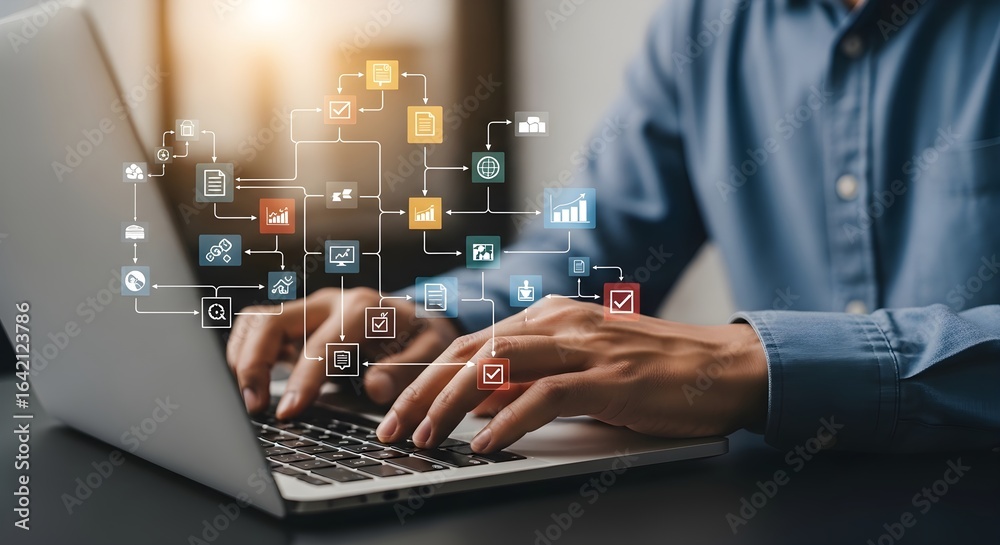 A person typing on a laptop with colorful flowchart icons coming out of it #1642123786
