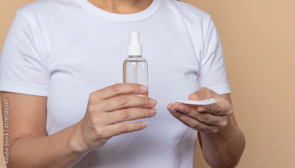 A person using cosmetic skincare product, holding a spray bottle and cotton pad for applying skincare products. The image highlights skincare products. #1781181347