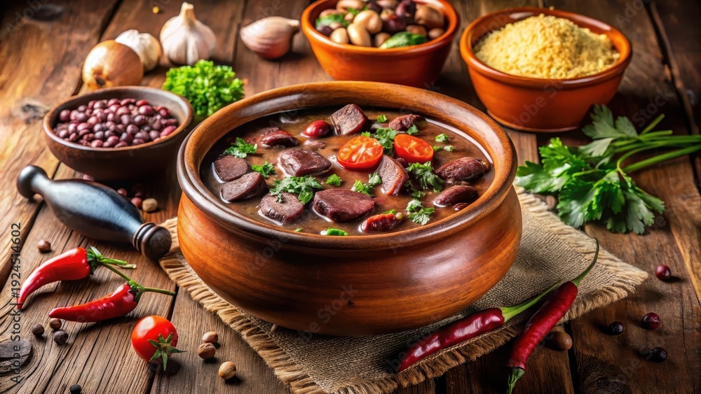 A photo of a traditional Brazilian feijoada simmering in a clay pot on a rustic wooden table, surrounded by sliced meats, garnished with cilantro an #1924514602