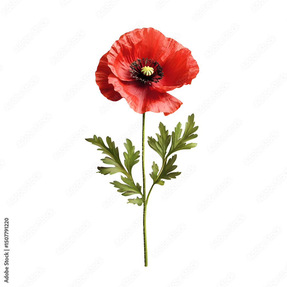 A photograph of a single vibrant red poppy flower with delicate petals isolated against a clean and minimalist white background #1507791220