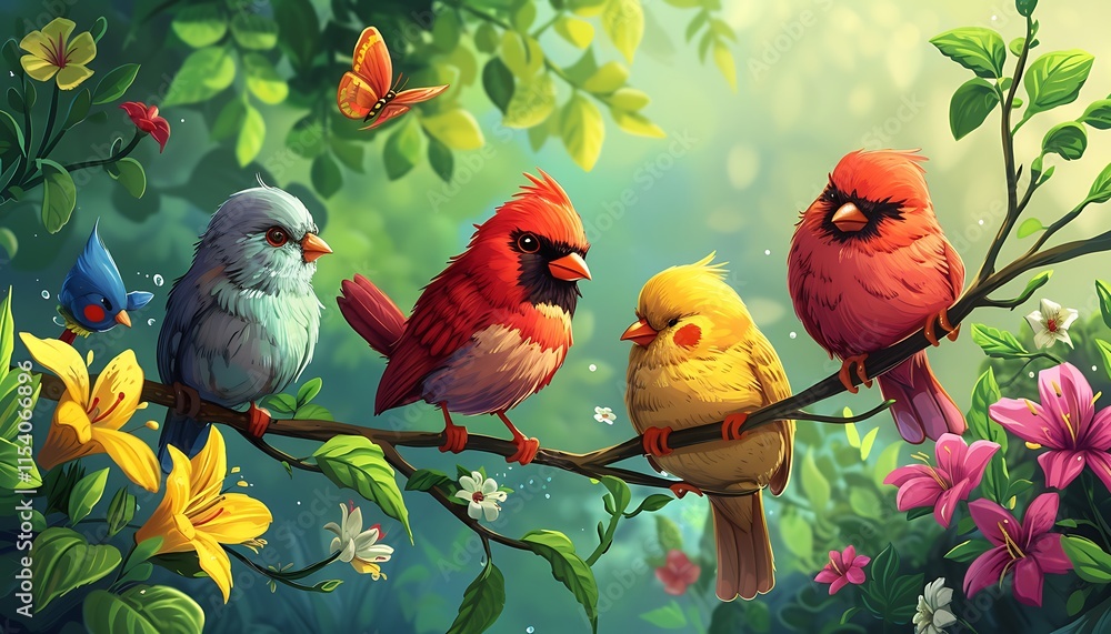 A picturesque gathering of colorful birds perched on a branch amidst vibrant flowers and lush greenery, glowing with morning light. #1154066896