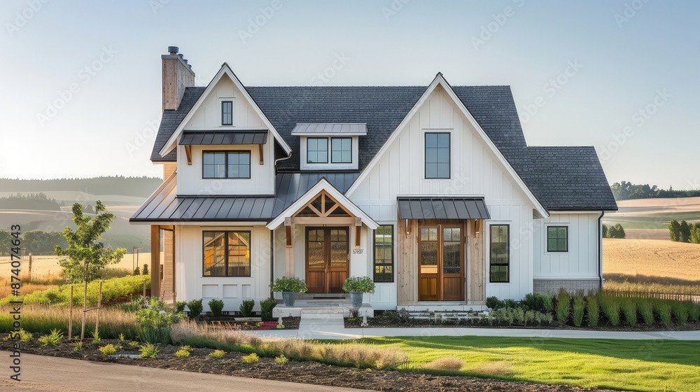 A picturesque modern farmhouse with a steep gabled roof, board and batten siding, and a charming front entry, set against a backdrop of rolling hills and fields. #874074643