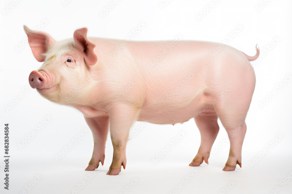 a pig standing on a white surface with its head turned #682834584
