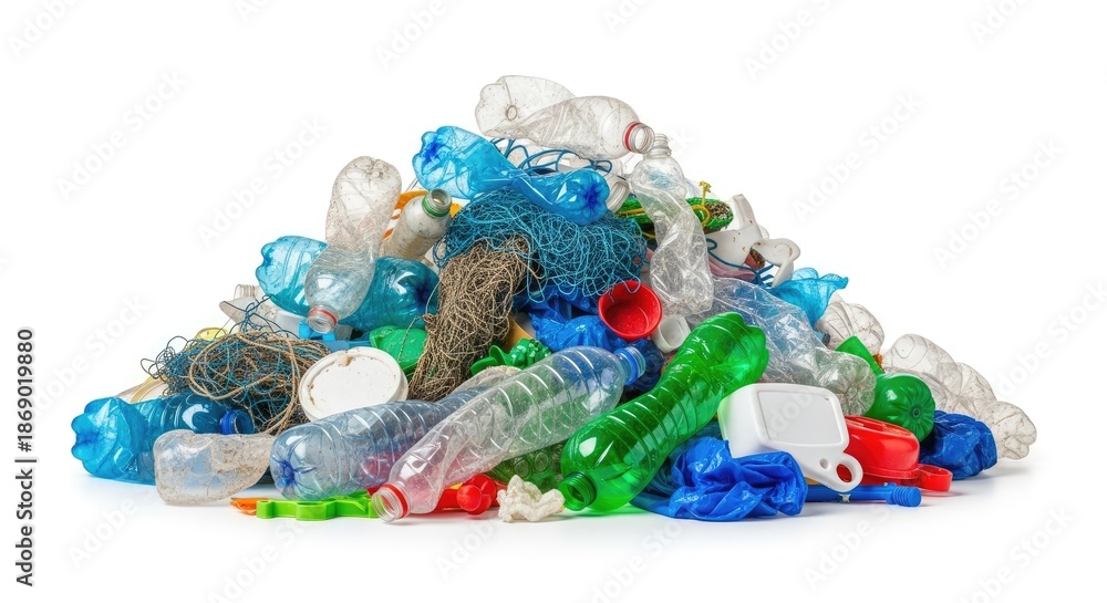 A pile of colorful plastic bottles and other waste materials on a white background. #1869019880