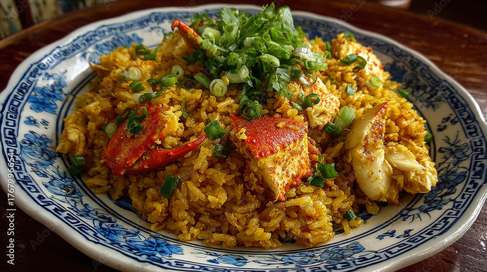 A plate of flavorful crab fried rice garnished with green onions and red chili, served on a traditional blue-patterned dish. #1767996654