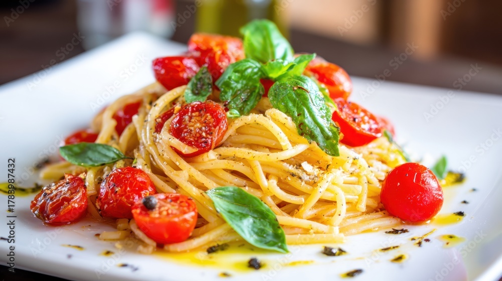 A plate of fresh spaghetti is topped with roasted cherry tomatoes and vibrant basil leaves. The dish glistens with olive oil under warm restaurant lighting. #1783987432