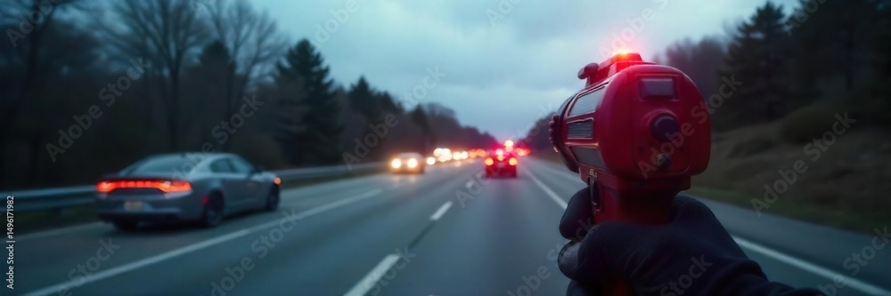A police radar speed gun pointed down a highway, with blurred cars in the background suggesting fast speeds The image emphasizes the technology used in speed enforcement , speed limit, technology #1496171982